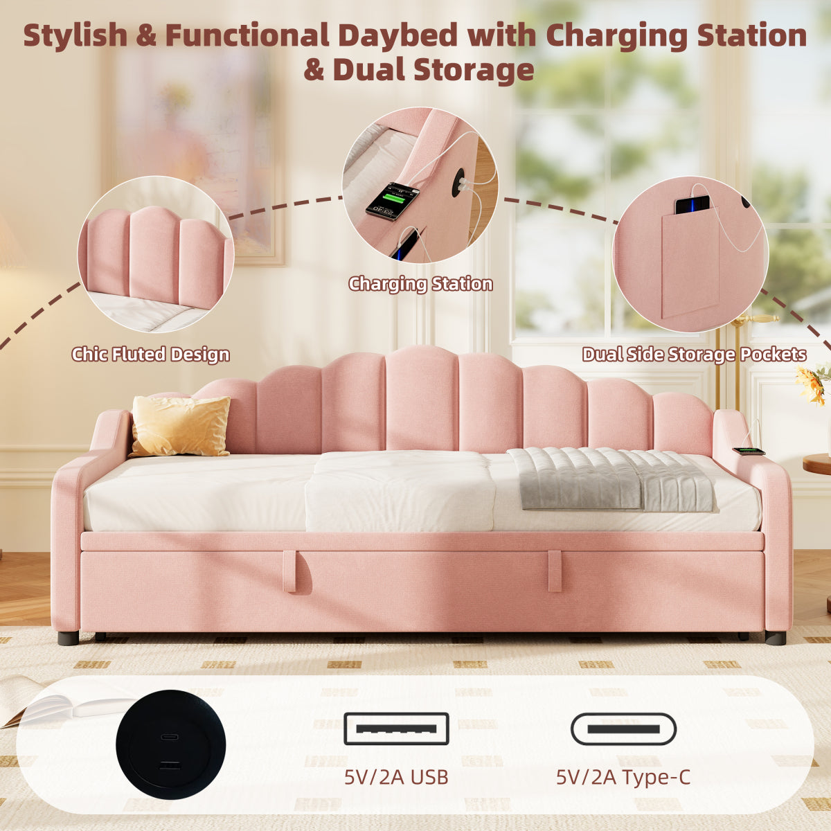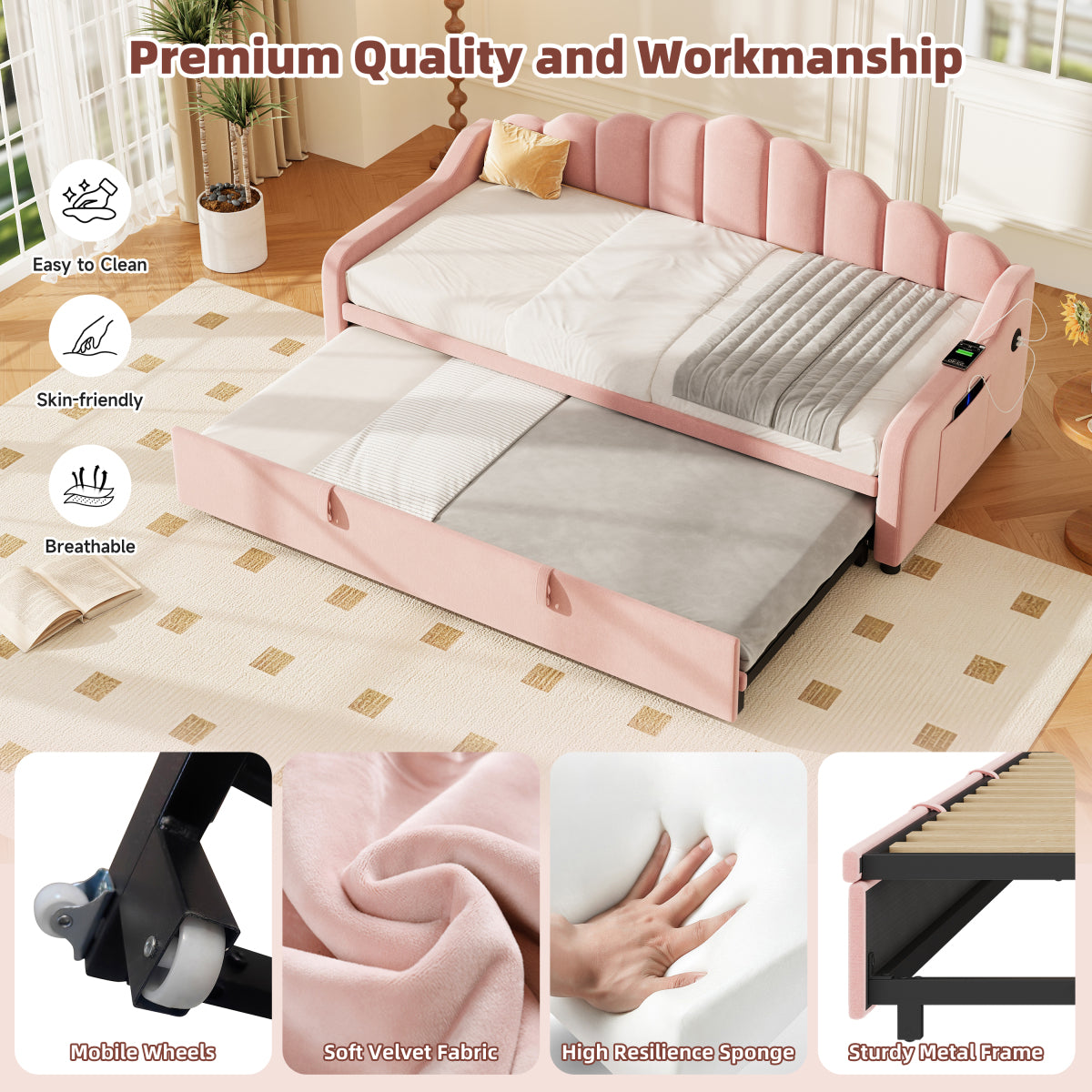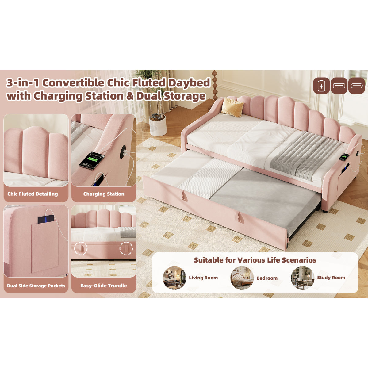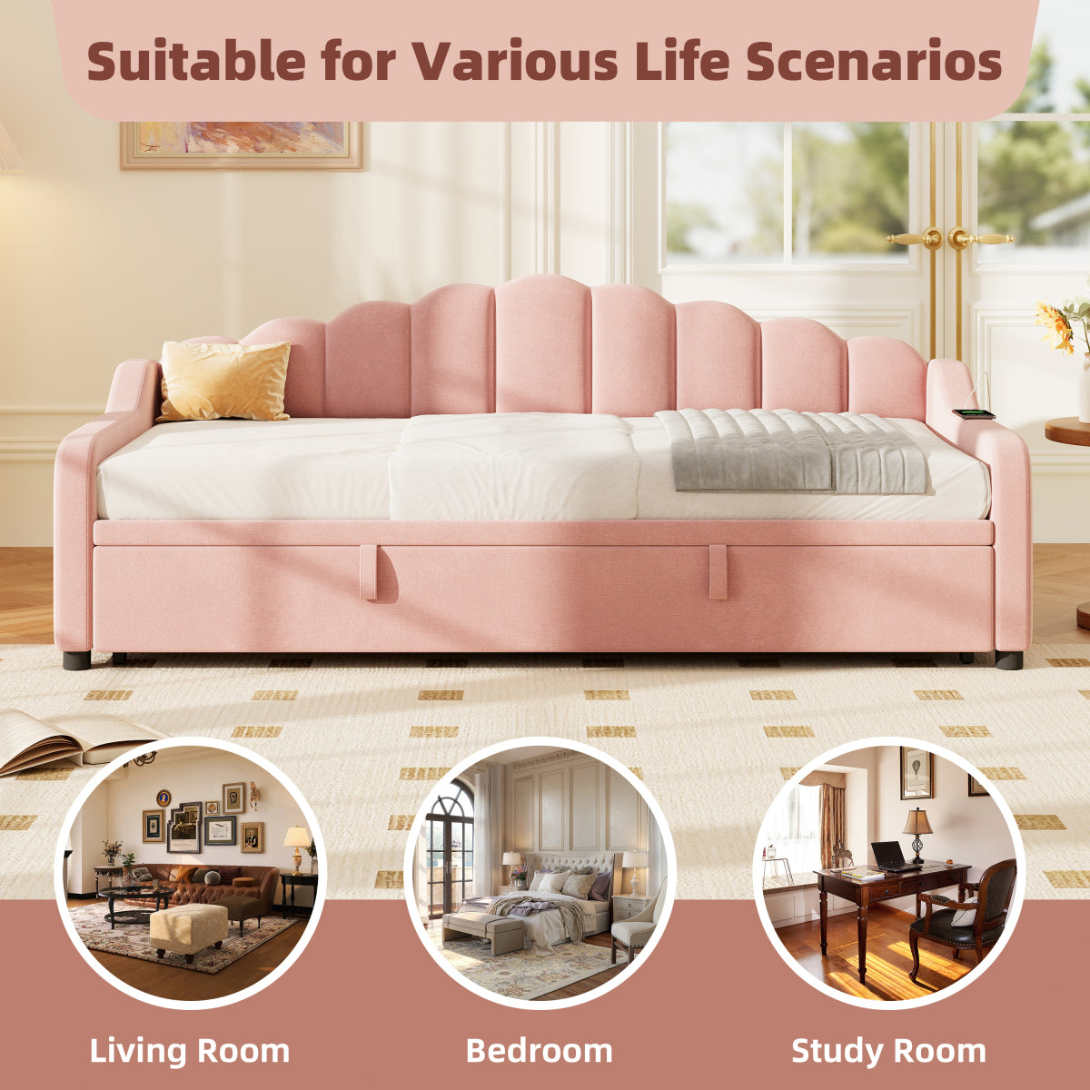 - [Space-saving Multiform Design] This daybed offers three convertible forms: sofa, trundle bed, and daybed.With the straps and bottom wheels, it can be easily converted from a comfortable sofa to a spacious sleeping area, making it ideal for maximizing your living space.