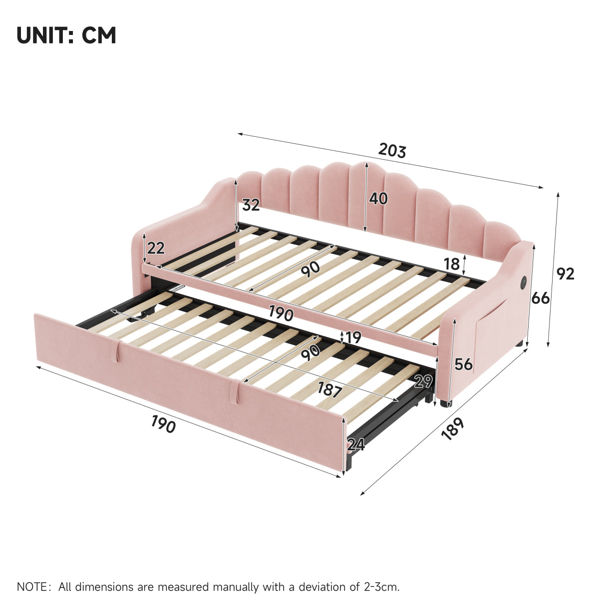 | Special Features | Charging station & Dual Side Storage Pockets & Skin-friendly velvet & Smooth-gliding wheels & Space-saving multiform design |