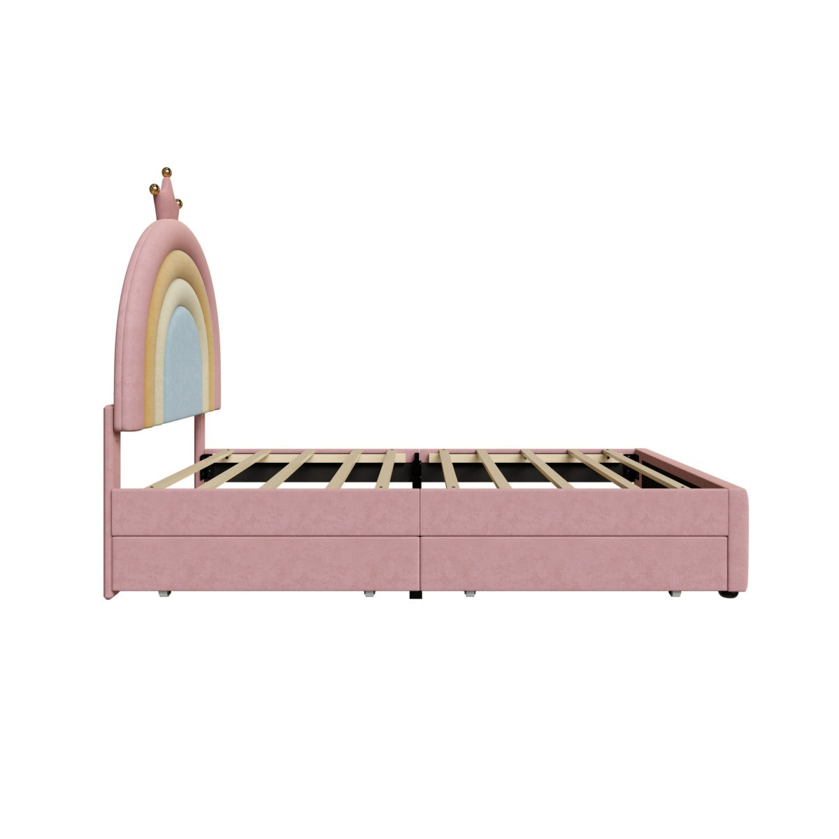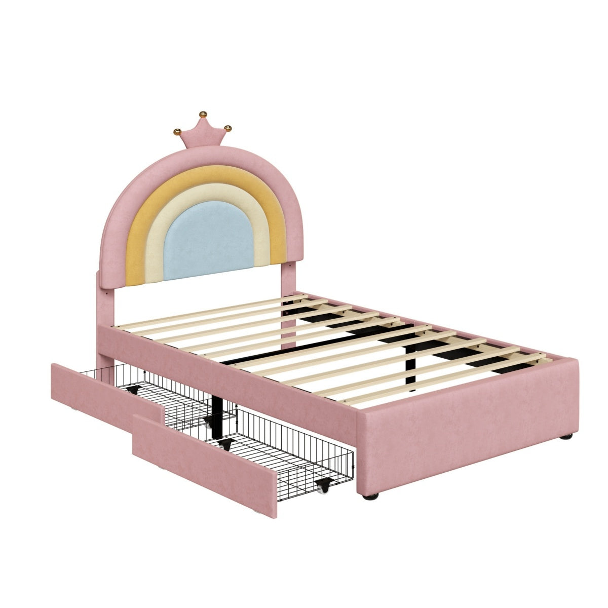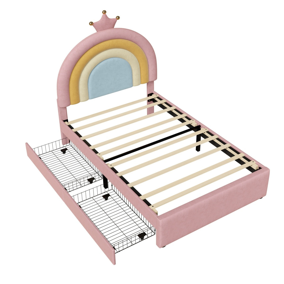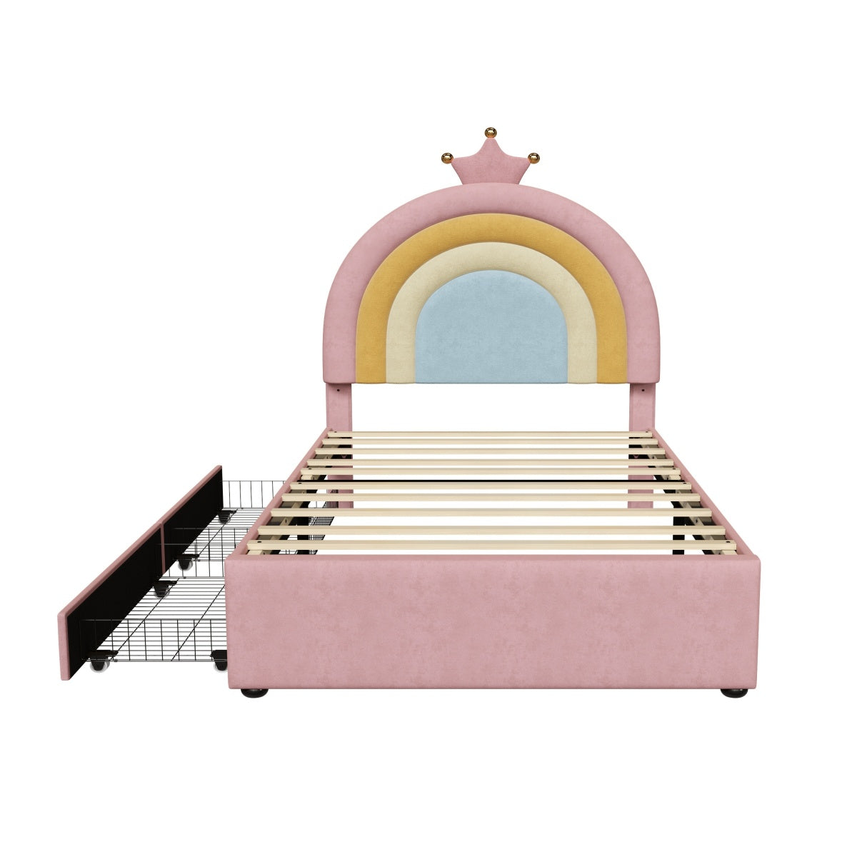 - [Enchanting Rainbow & Crown Aesthetic] Featuring a vibrant rainbow-inspired headboard topped with an elegant golden crown detail, this bed creates a magical and cheerful focal point for any child's bedroom.The whimsical design sparks imagination while theSleek curved headboard design helpful to protect kids from hurting by sharp edges.