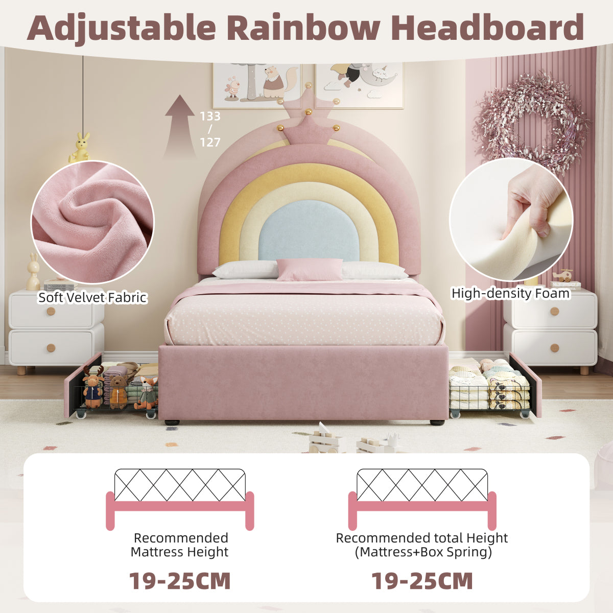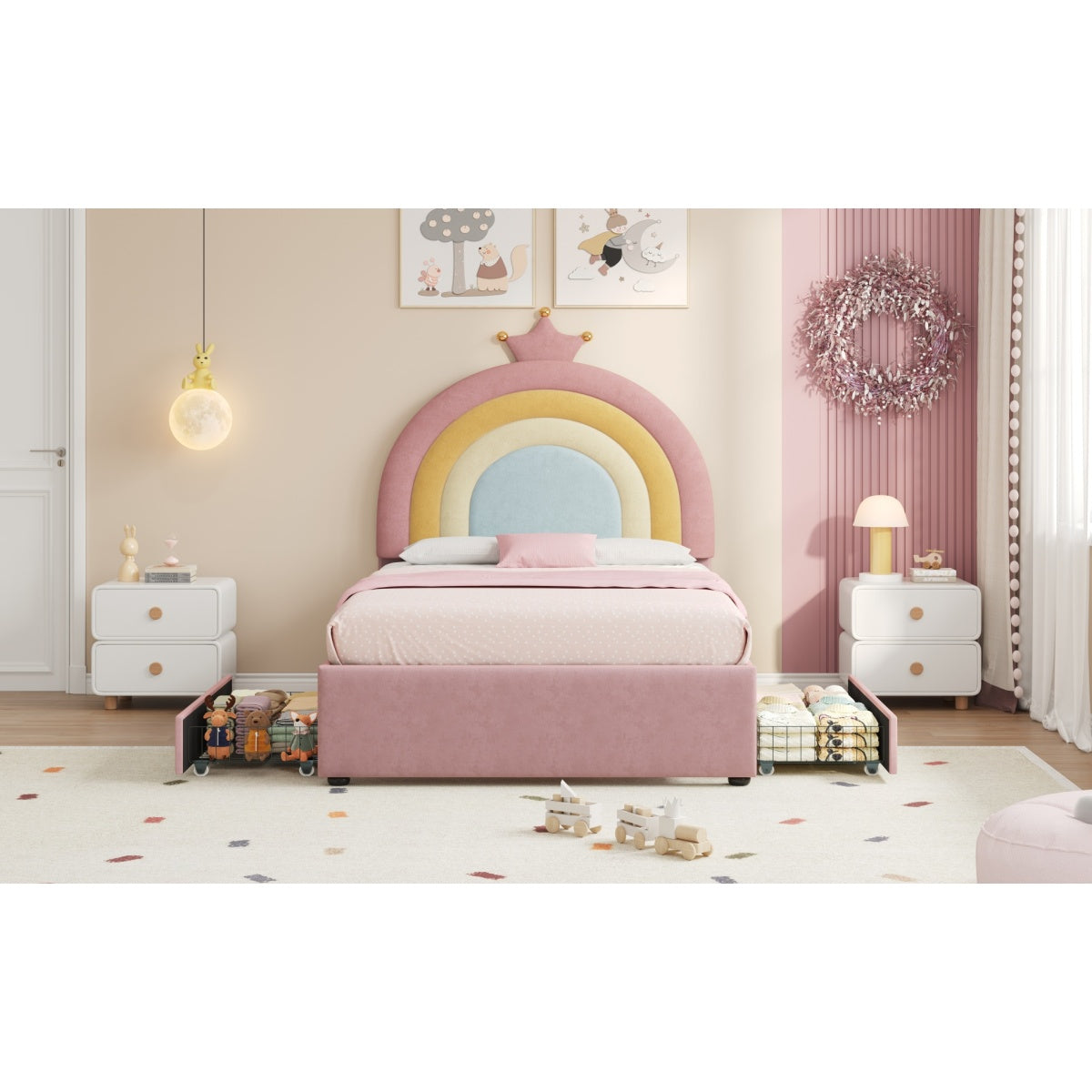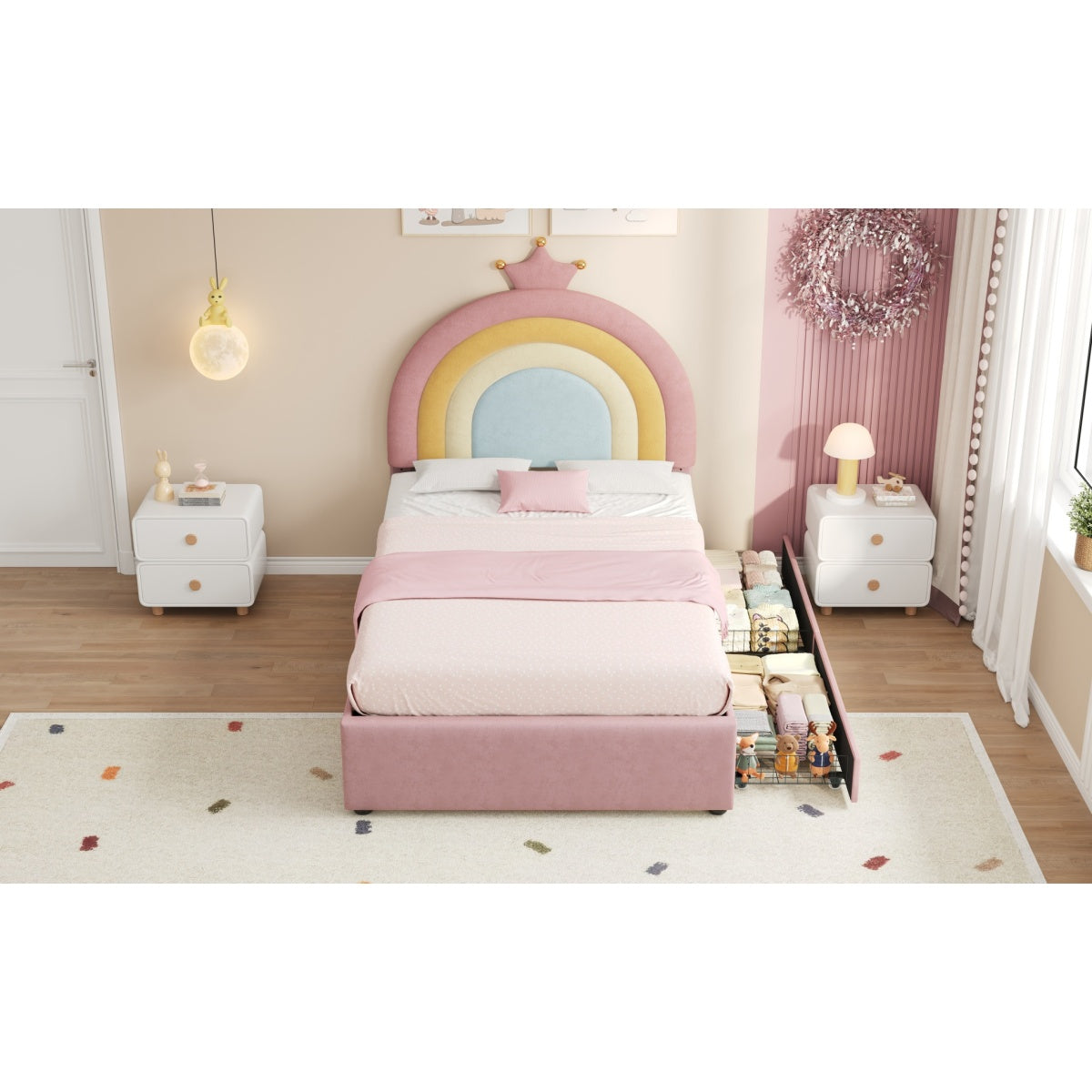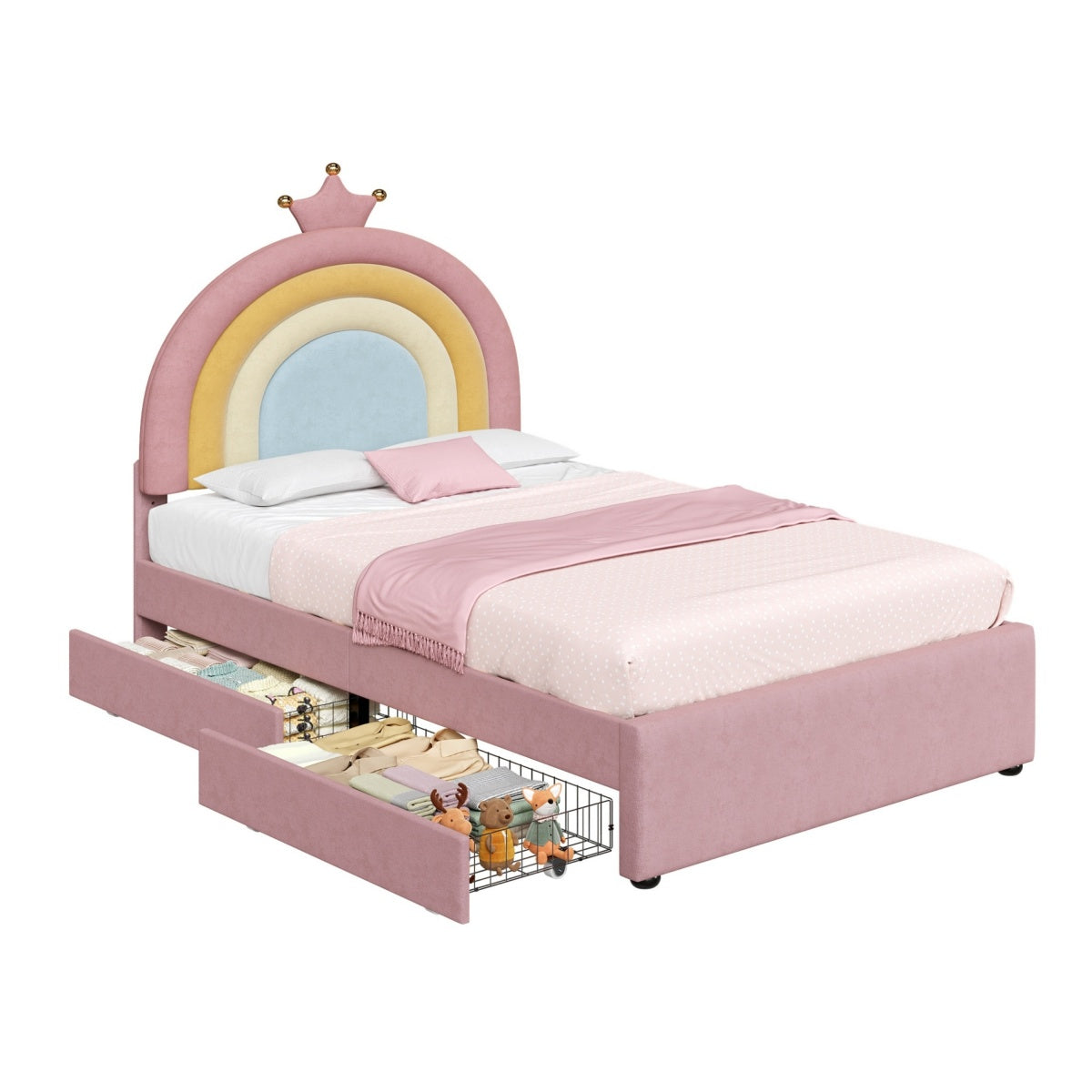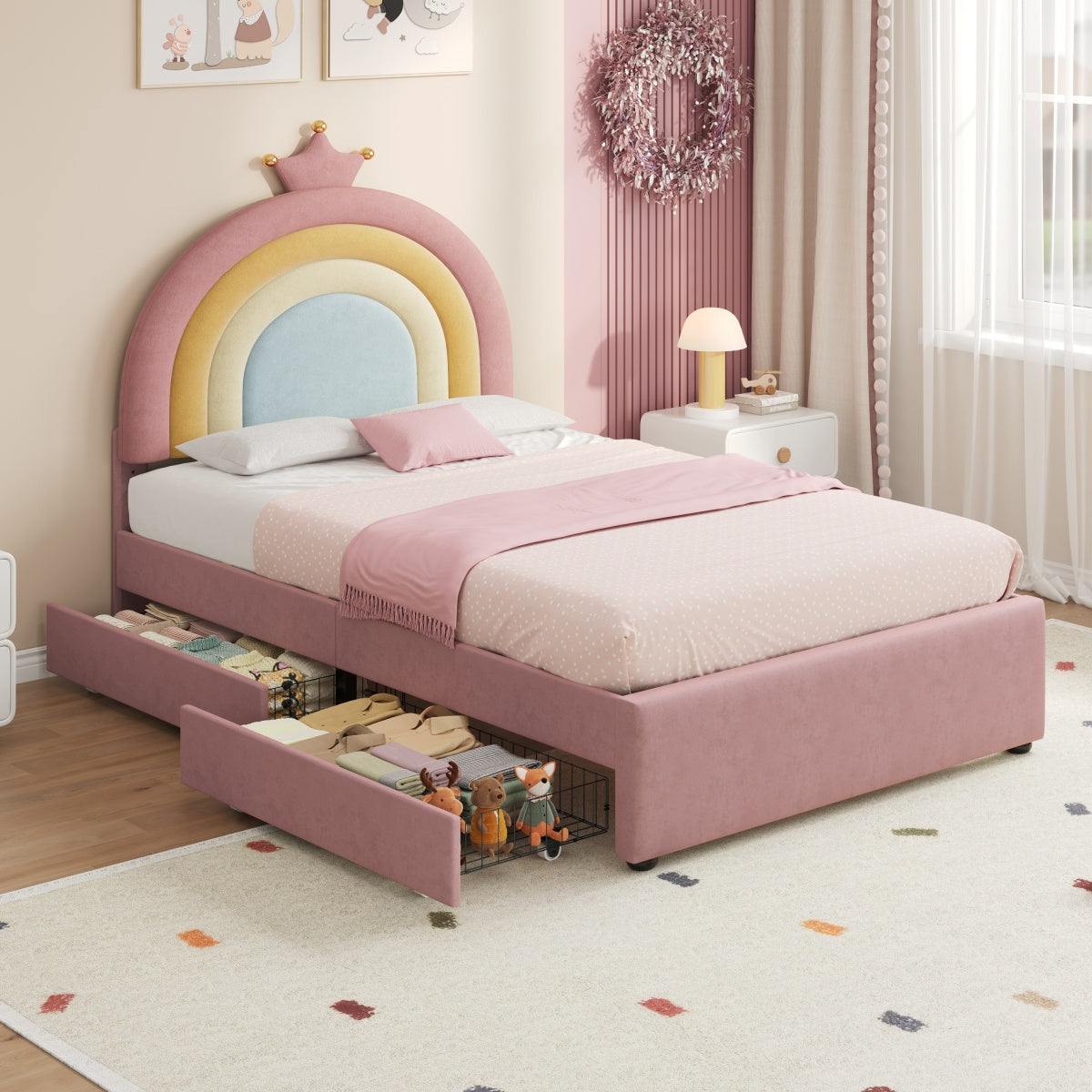 - [Enchanting Rainbow & Crown Aesthetic] Featuring a vibrant rainbow-inspired headboard topped with an elegant golden crown detail, this bed creates a magical and cheerful focal point for any child's bedroom.The whimsical design sparks imagination while theSleek curved headboard design helpful to protect kids from hurting by sharp edges.