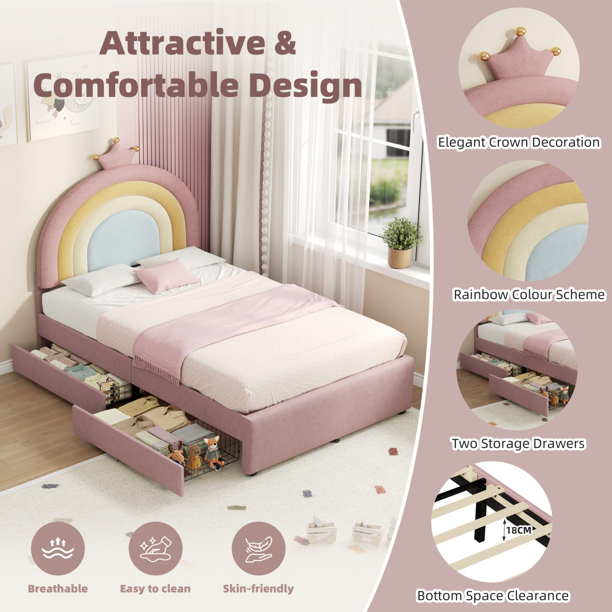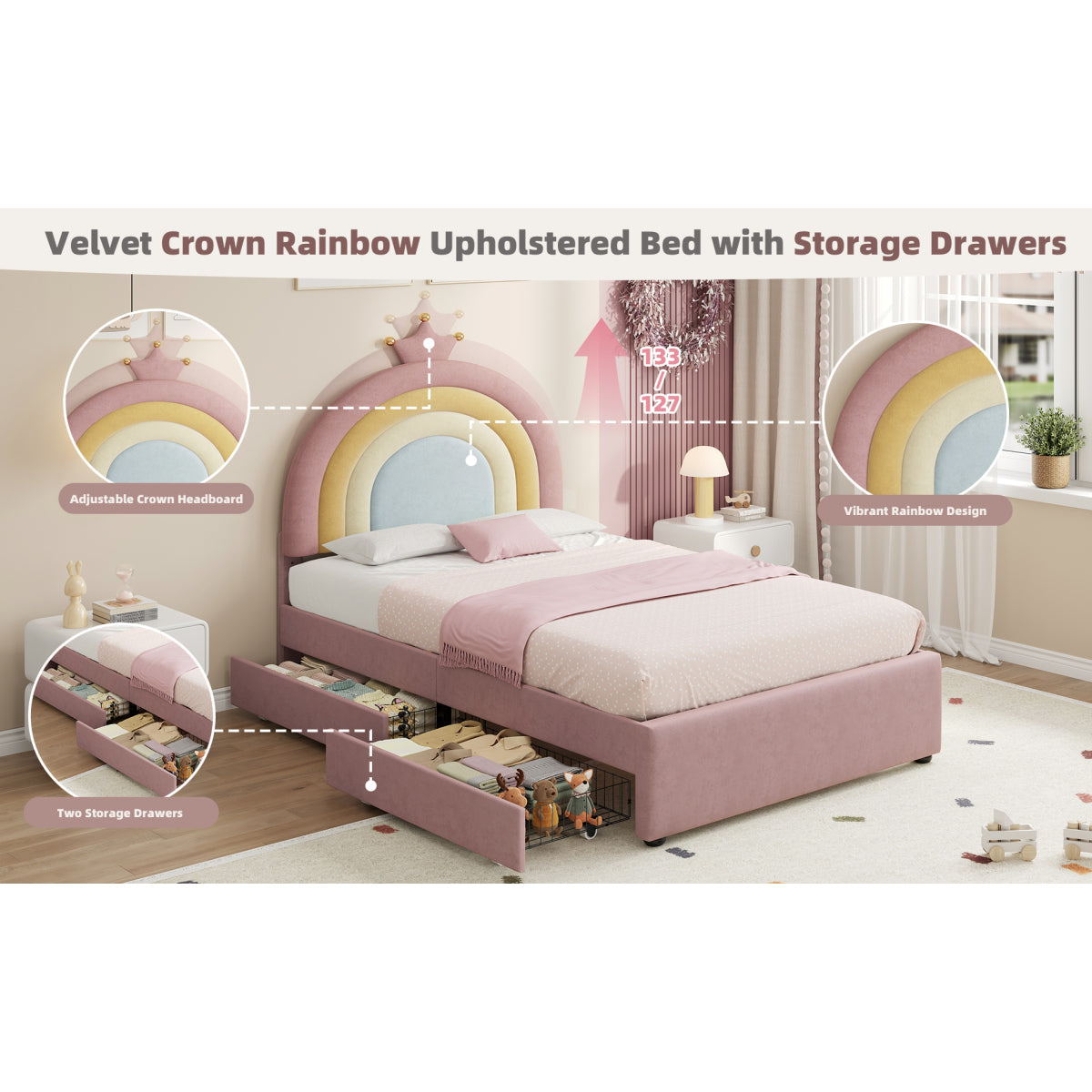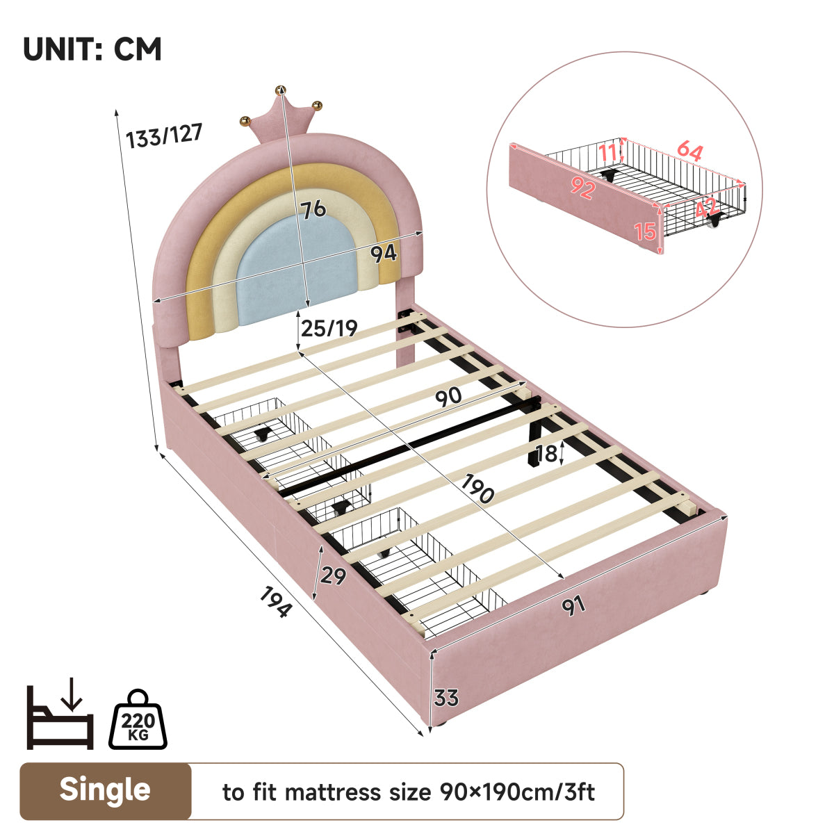 | Special Features | Space saving storage drawer & Adjustable rainbow headboard & Elegant crown decoration & Bottom space clearance |