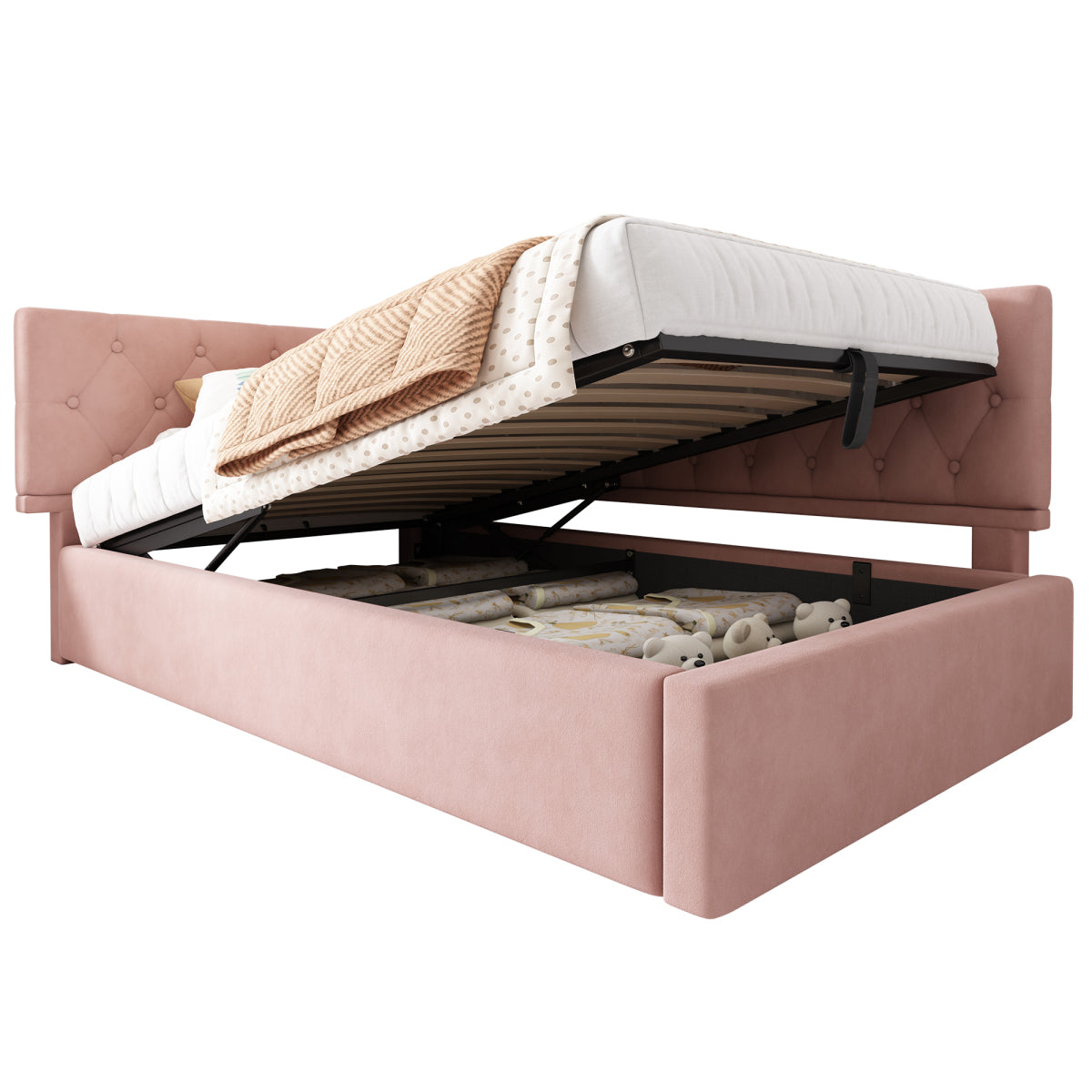 - 【Under-bed Storage Function】The hydraulic storage compartment under the bed offers spacious and concealed storage space, especially suitable for small apartments.The practical drawstring opening and closing design allows for easy access to the storage compartment and removal of items.The dust-proof cloth under the bed ensures that the storage space is always clean and tidy.