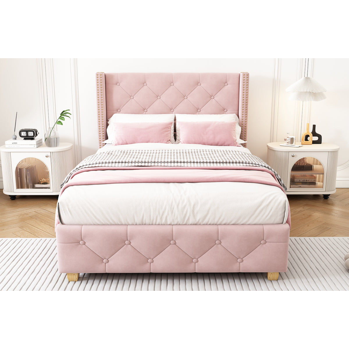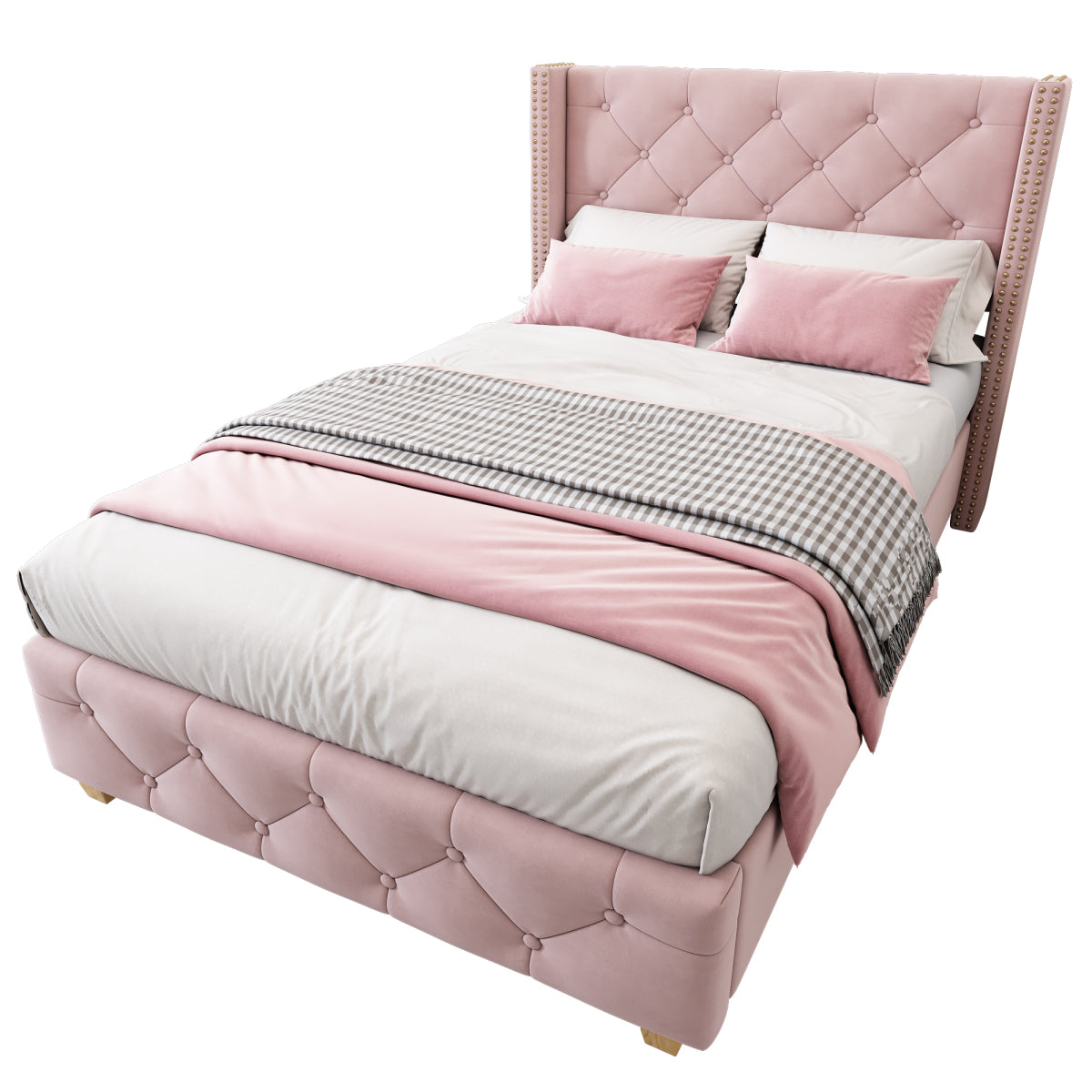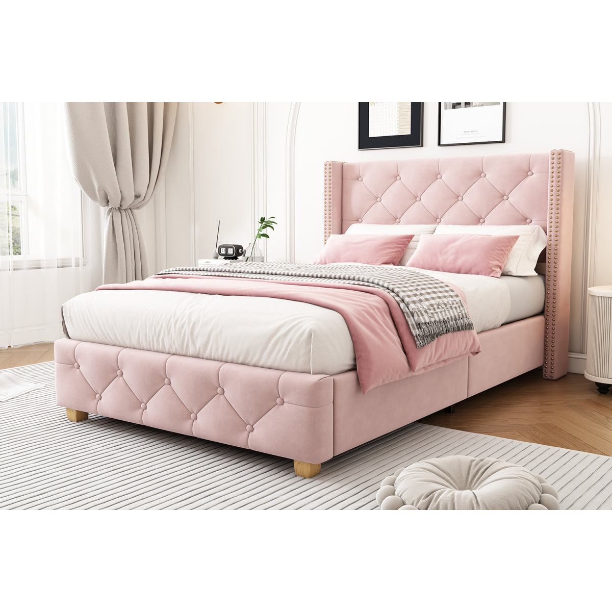 - Premium Materials: This soft upholstered bed features a luxurious design with a soft velvet fabric cover.The use of high-quality velvet gives the bed an attractive, elegant finish.